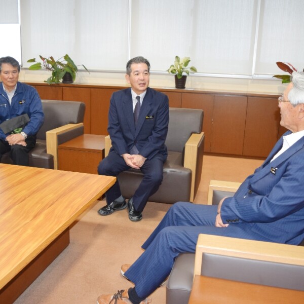 2月1日付で宮古野球連盟の新会長となった與那覇武光さんと平良武前会長が26日、宮古新報社(洌鎌敏一会長)に新城竜太社長を訪ね就任あいさつを行った。
