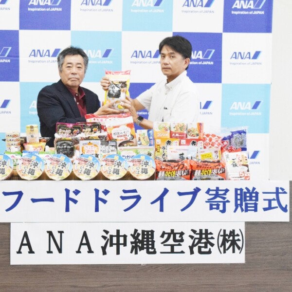 ANA沖縄空港宮古事業部(具志英樹部長)は25日、フードドライブで集まったレトルト食品やカップ麺など約100点を市社会福祉協議会(野原勝会長)のフードバンク「んまんま」に贈った。