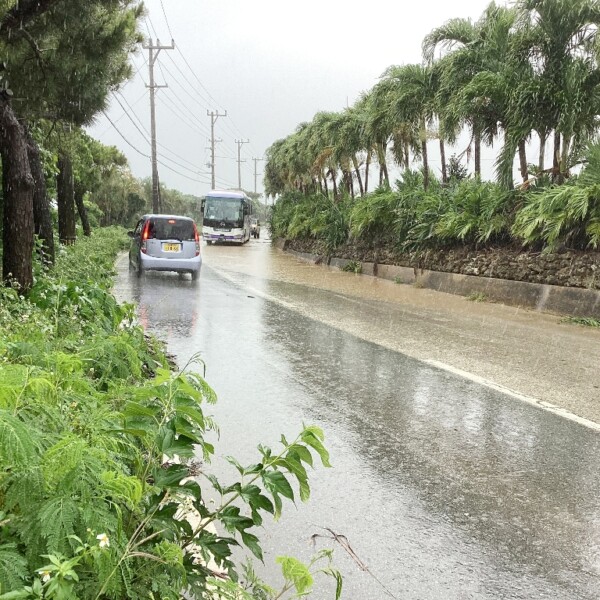 18日午前、宮古島地方で20㍉弱の降雨によって各所で冠水するなど市内の交通事情に弊害を及ぼした。