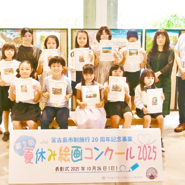 市制施行20周年記念事業の一環として、第7回夏休み絵画コンクール(下地島エアポートマネジメント主催)の表彰式が26日、下地島空港ロビーで行われた。