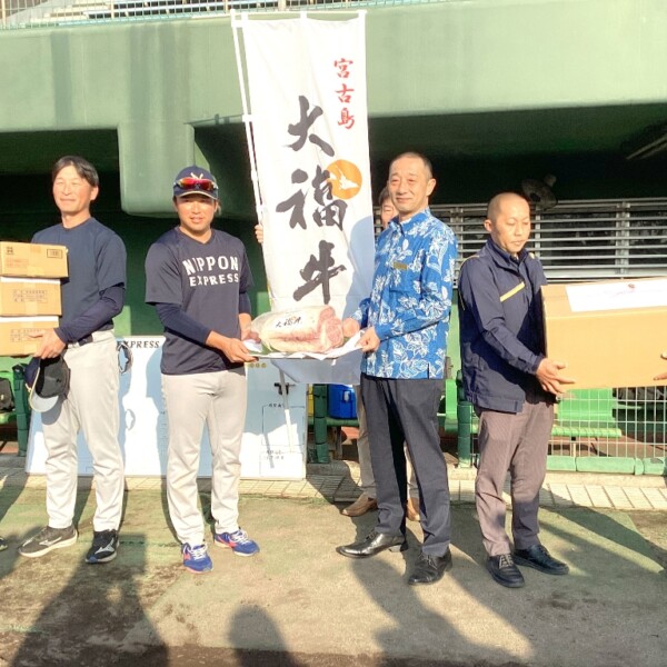 市スポーツ協会、ホテルアトールエメラルド宮古島、オリックスレンタカー宮古島の3団体が12日、市民球場で練習開始前のノンプロ日本通運硬式野球部に地元特産品を贈呈した。