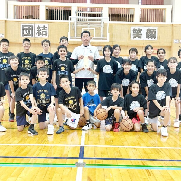 久松学区体育協会(久貝将智会長)は18日、第38回県ミニバスケットボ―ル冬季選抜大会に出場する久松小学校男女ミニバスケットボール部に同体協の有志で集めた寄付金を「遠征費に充ててほしい」と両キャプテンに進呈した。
