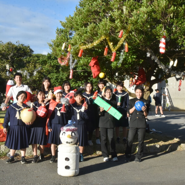 7日に海岸清掃を行った北中学校生徒会は18日、有志のメンバーとともに同校中庭にある木にペットボトルやぶいなどのごみを再利用したクリスマス仕様オーナメントの飾り付けを行った。26日まで飾られる予定。