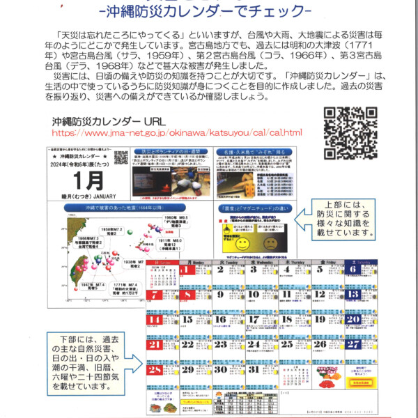 宮古島地方気象台は、ホームページからダウンロードできる「2024年沖縄防災カレンダー」の活用を促している。