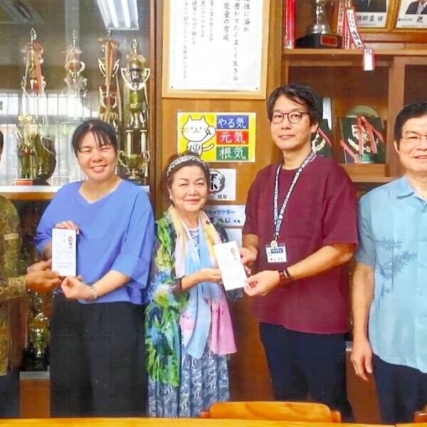 下地中学校第23期卒業生による古稀同窓会(洲鎌長榮会長)が1日に開催され、母校の下地小学校と下地中学校へ寄付金を贈呈した。