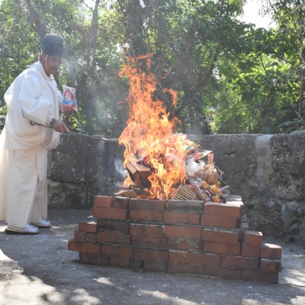 お札、お守りの縁起物などを燃やす「古神礼焚上祭」が15日、宮古神社の境内で行われた。