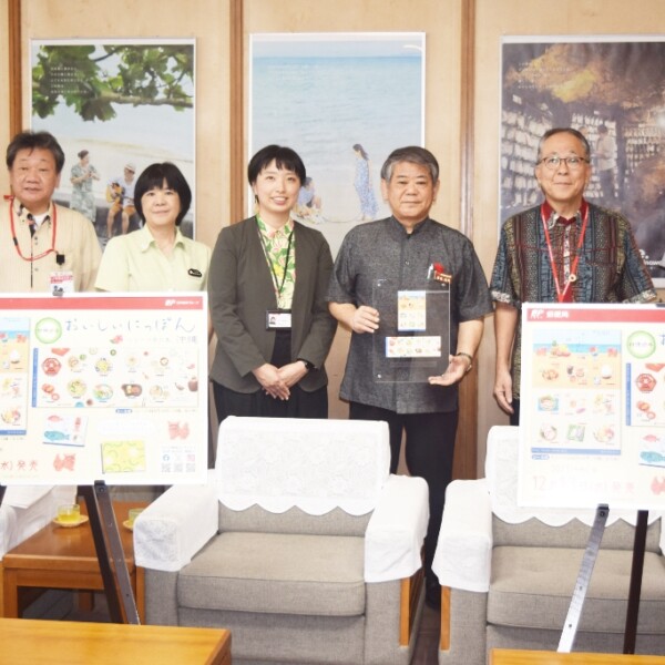 沖縄料理描いた切手発行 日本郵便沖縄支社 照屋副知事に贈呈