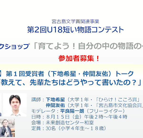 市文化協会(饒平人和枝会長)は、第2回「U18短い物語コンテスト」に関連したワークショップ「育てよう!自分の中の物語のタネ」の第2回をあす15日午後2時から未来創造センター内の和室で開催する。