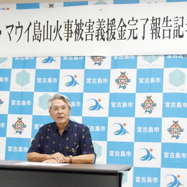 宮古島市(座喜味一幸市長)は31日、市役所庁議室で記者会見を開き、市全体で取り組んだ米ハワイ・マウイ島山火事被害への義援金募金活動の完了を報告した。