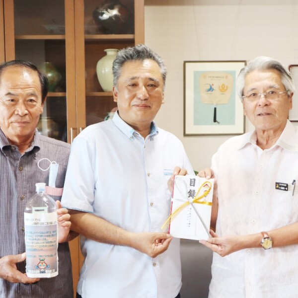 宮古島商工会議所の根路銘康文会頭らは1日、市役所に座喜味一幸市長を訪ね、米ハワイのマウイ島で起きた大規模火災への義援金を手渡した。