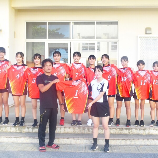 宮良自動車整備工場(宮良清栄代表)は8月31日、平良中学校女子バレー部にユニフォームを寄贈した。