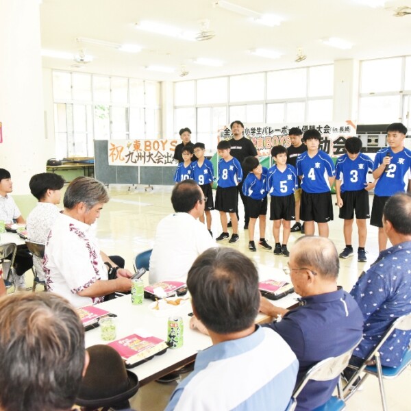 25日から長崎県で行われる第38回全九州小学生バレーボール優勝大会in長崎に出場する東ボーイズ(與那覇也寸志監督)の祝勝・激励会が30日、東小学校ランチルームで行われ、多くの関係者が大会での活躍を願い集まった。