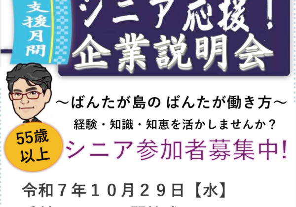 55歳以上の求職者を対象に、地域で経験や知識を生かして働きたい人と人材を求める企業との出会いの場を設ける「シニア応援企業説明会~ばんたが島のばんたが働き方~」(主催・ハローワーク宮古、宮古島市)が29日、市役所2階大ホールで開催される。