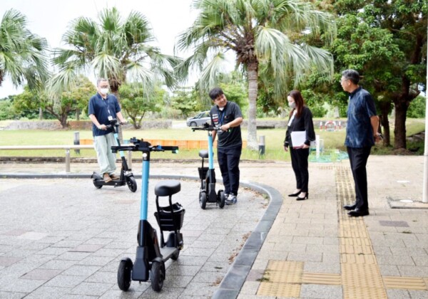 沖縄トヨタ自動車と次世代モビリティBRJは24日、下地上地の宮古島観光協会で小型モビリティ実証事業の発表と試乗体験会を開いた。