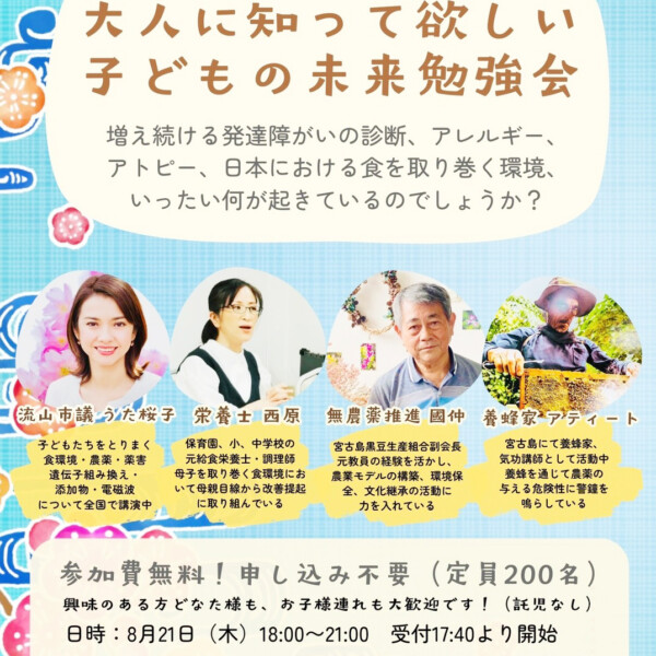 農薬や水問題、薬害による「新型栄養失調」に着目し、子どもたちの健康や未来を守るための学びの場として、「大人に知って欲しい子どもの未来勉強会」(宮古島薬害勉強会主催)が8月21日に未来創造センター多目的ホールで開催される。