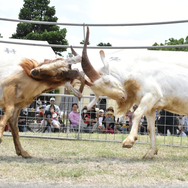 【多良間】4年ぶりの通常開催となる第23回多良間島ピンダアース大会(主催・同実行委、伊良皆光夫委員長)が20日、同村多目的広場で行われ、軽・中・重量級の3階級に分かれて24頭のヤギが戦った。