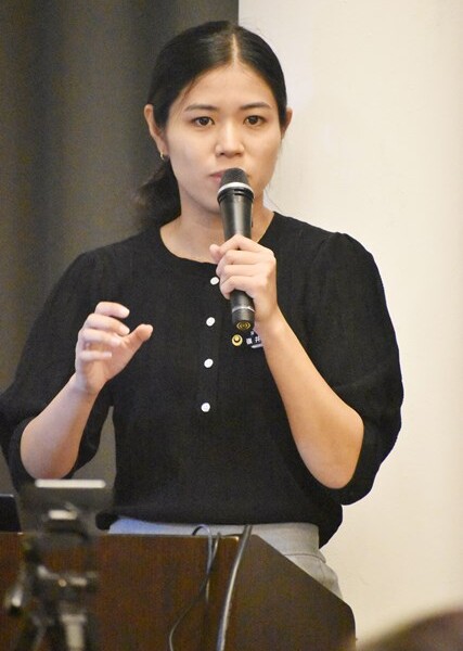 嶺井さん(宮古農水センター)が発表 オクラ生産振興の取組紹介