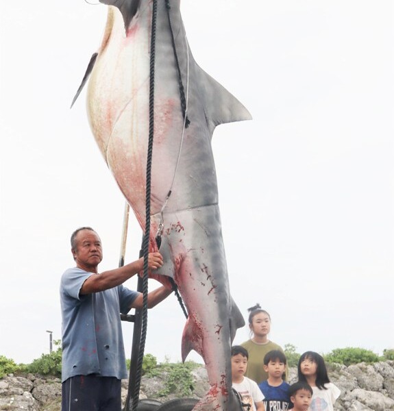 海の安全を守るためボランティアでサメの駆除に取り組んでいる砂川博一さんは14日、宮古島近海で3頭のイタチザメを捕獲。