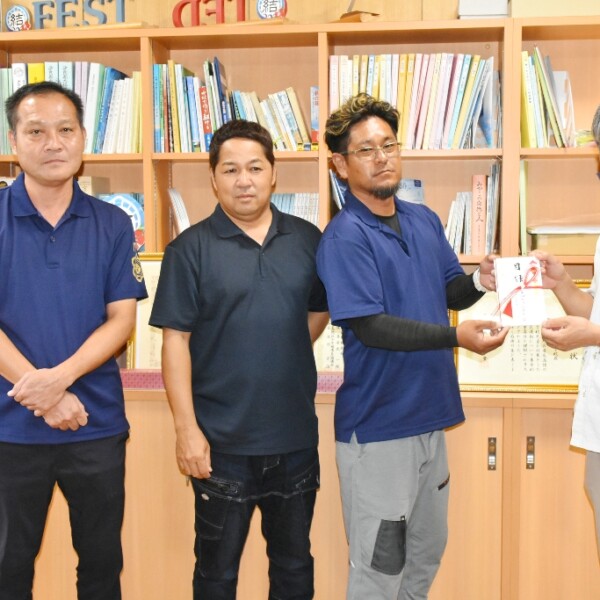 佐良浜の伝統行事ミャークヅツの「ミーウヤ」となった昭和54年生同期生(伊良皆紀寿会長)が10日、伊良部島小中学校(結の橋学園)を訪れ、「運動会の練習に取り組んでいる児童生徒たちの熱中症対策などに使ってほしい」と寄付金を贈った。
