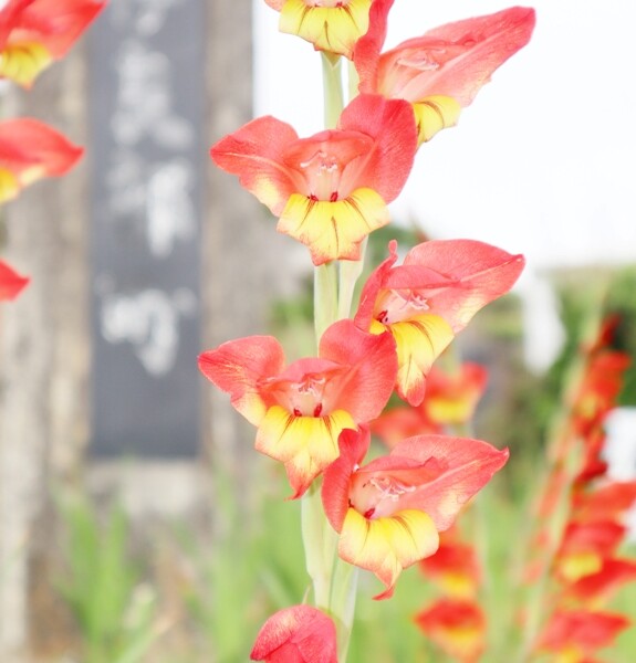 伊良部池間添にある旧伊良部町時代のモニュメント周辺で21日、群生のグラジオラスが満開の花を鮮やかに咲かせていた。