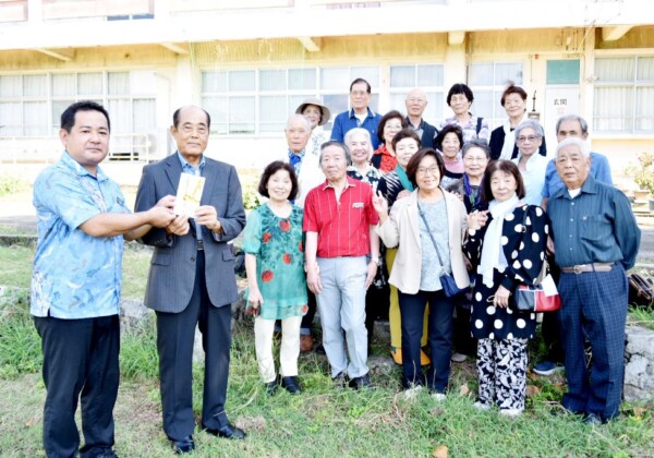 宮古島商工会議所青年部(YEG、横山昌司会長)は24日、平良西仲宗根の漲水学園(嵩里公敏園長)を訪問し、きょう25とあす26の両日に開催される宮古島夏まつり2025の金魚すくいブースで使用できるポイ引換券32枚を子どもたちに贈呈した。