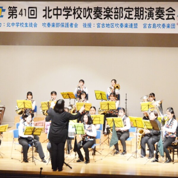 北中学校吹奏楽部(顧問・根間絵里香教諭)の第41回定期演奏会が19日午後、未来創造センター多目的ホールで開催され、部員たちが息の合った演奏で詰めかけた父母や在校生ら観客を魅了した。