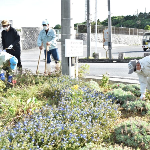 花と緑の美しい我が地域づくりクラブ(川上政彦代表)は12日、宮古工業高校駐車場前でトライアスロン宮古島大会に向けて花苗の植付けや植栽の整備を行った。