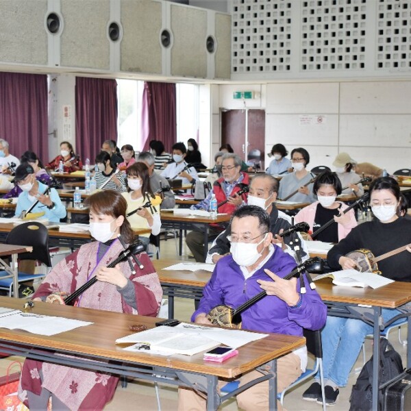 「さんしんの日」の4日、県内各地をはじめ海外でも愛好者たちが集い、時報に合わせて一斉に「かぎやで風」を演奏するなど三線を高らかに響かせた。