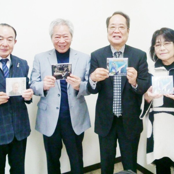 作詞・作曲を手がける豊見城市在住の野原勝己さん(80)=下地与那覇出身=と野原さんの活動を支援する豊里利行さん(71)=伊良部長浜出身=らは2日、宮古新報社を訪れ、1月に発売されたCD「伊良部大橋音頭」をPRした。