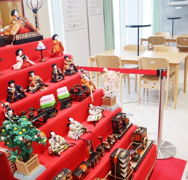 宮古島市立図書館に現在、ひと足早くひな人形が飾られている。館内は原則撮影禁止だが、人形の前のみ可能。