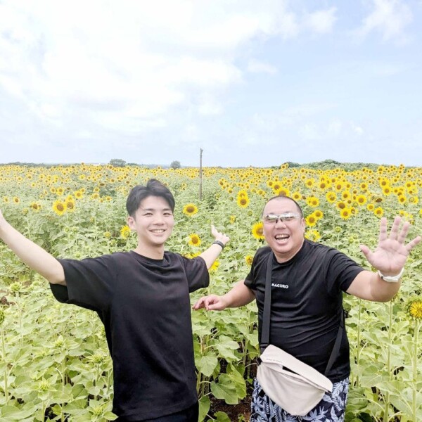 宮古空港近くの空港南信号にあたる丁字路、国道390号沿いで、ひまわりが一斉に開花し、黄色い花が夏の陽光を浴びて咲き誇っている。