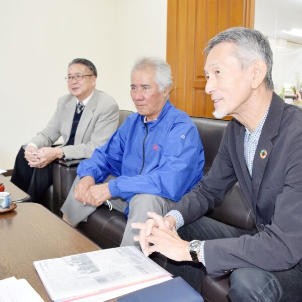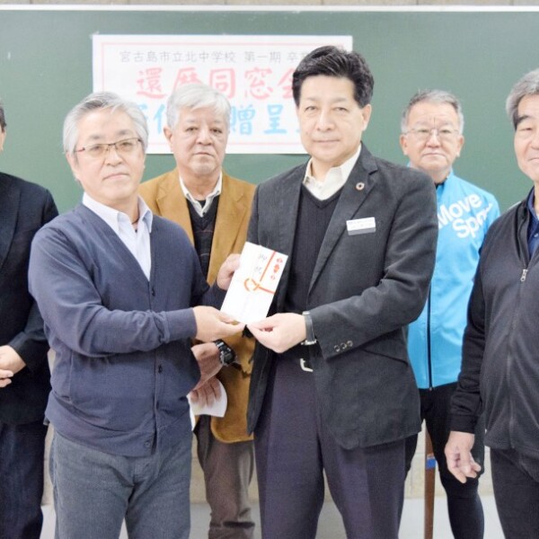 北中学校第1期卒同窓会(池間康会長)の会員らが31日、同校に久高三彦校長を訪ね、還暦記念の寄付金を贈呈した。