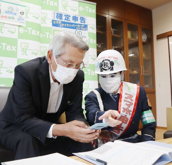 座喜味一幸市長は27日、市役所で、宮古島税務署でスマホ申告大使などを努める宮古島まもる君のサポートを受けながら、スマホでのe―Tax申告を体験。