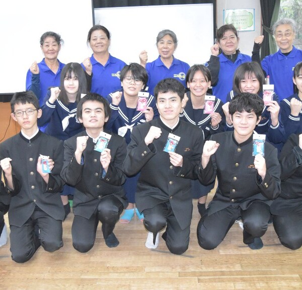 平良西原で神行事を行う女性たちからなる「ニシムラカギナナムイ」が24日、西辺中学校の3年生12人に手作りした合格祈願のお守りを贈呈した。