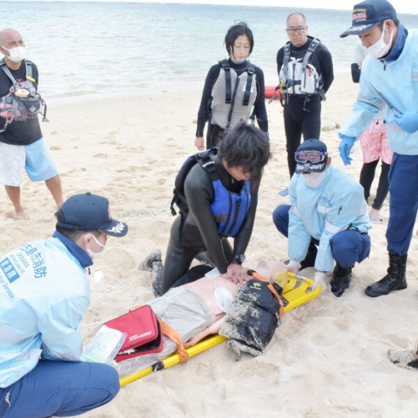 OMSB(沖縄マリンレジャーセイフティービューロー)宮古島連絡会(前原勉事務局長)・ACT-1が主催する第1回宮古島マリンレジャーガイド合同シミュレーショントレーニングが5日、新城海岸で行われた。