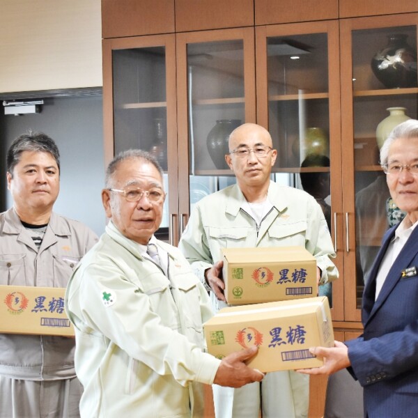 宮古製糖の渡久山和男社長は23日、宮古島市(座喜味一幸社長)に2022/23年産サトウキビ製糖期の多良間産新黒糖を贈呈した。
