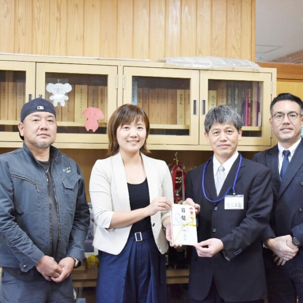 建設コンサルタント会社のシグマ(佐和田はるか代表)は6日、平良第一小学校創立140周年記念事業期成会に寄付を行った。