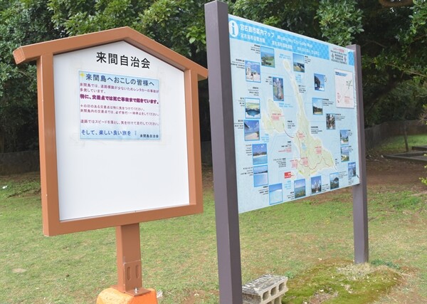 来間島自治会はこのほど、交差点でのレンタカーによる事故が多発していることへの注意を促す喚起文を島内12カ所に掲示した。