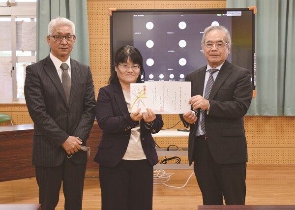 日本教育公務員弘済会沖縄支部の上地弘志支部長と屋嘉比邦昭参事は20日、宮古特別支援学校に教育支援の助成金を贈呈した。共済事業で提携するジブラルタ生命宮古島営業所の藤田樹一郎所長が同席した。