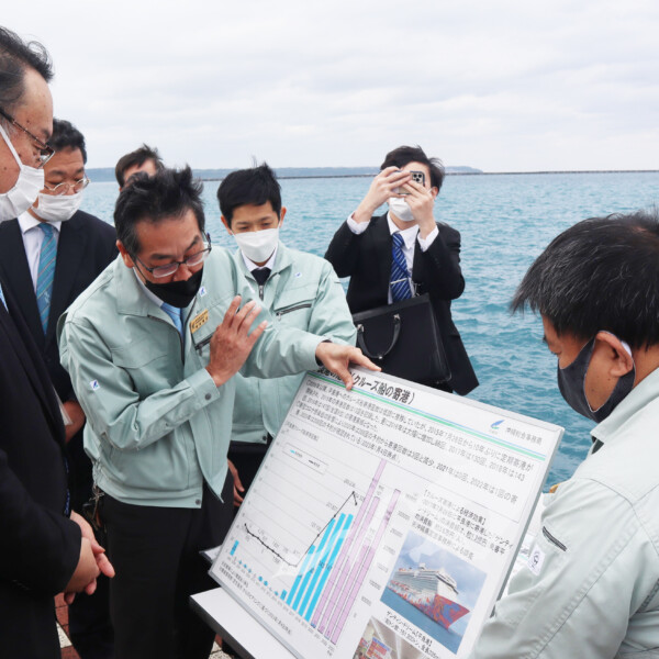 岡田直樹沖縄担当相は18、19の両日、大臣就任後として初めて宮古島市を訪問。19日は平良狩俣の市海業センターから始まり、平良港国際クルーズ拠点や下地島空港など、市内各地の官民施設を視察した。