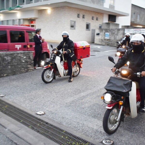 日本郵便宮古郵便局(井上和之局長)は1日、約13万6千通の年賀状を配達した。初日の出に合わせてオートバイに乗った配達員が郵便局を出発し、市内の各家庭を回って元旦の思いを伝える年賀状を届けた。