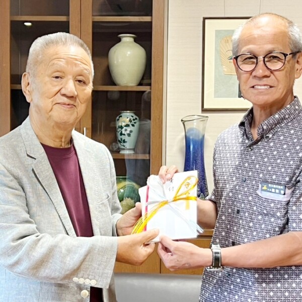京都府で創業100年を迎える建設業を営む梅田一夫さんが10日、夫婦で市役所を訪れ、嘉数登市長に100万円を寄付した。