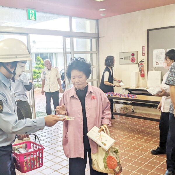 上野地区の敬老会が行われた11日、宮古島地区交通安全協会(下地隆之会長)は上野公民館で会場を訪れた敬老者らに「チラシ・宮古島まもる君プチギフト」を配布し、高齢者の交通事故防止の啓発活動を行った。