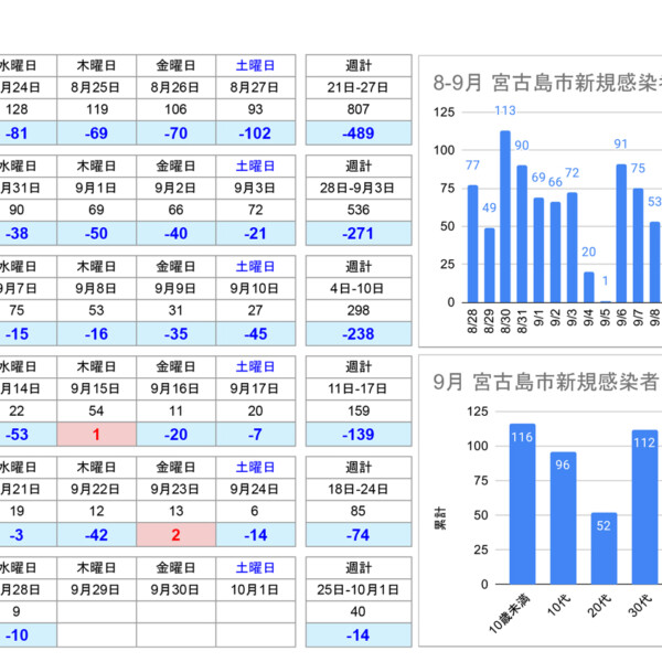 沖縄県は28日、宮古島市在住の新型コロナ感染者9人を確認したと発表。入院療養者は4人(中等症2人、軽症2人)。県での直近1週間...