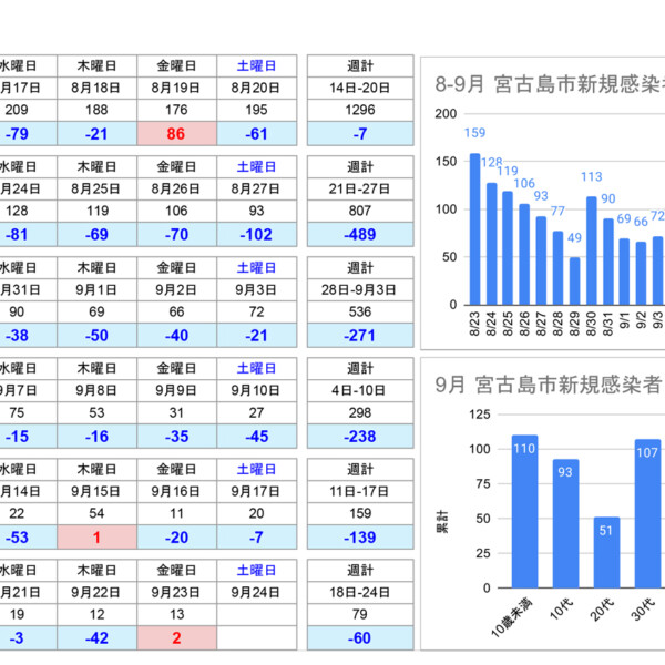 沖縄県は23日、宮古島市在住の新型コロナ感染者13人を確認したと発表。入院療養者は3人(中等症2人、軽症1人)。市での直近1週...