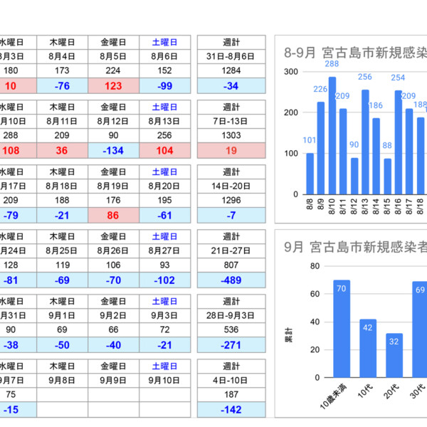 沖縄県は7日、宮古島市在住の新型コロナ感染者75人を確認したと発表。入院療養者は5人(中等症2人、軽症3人)。市での直近1週間...