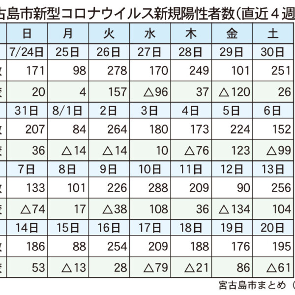県は20日、宮古島市で新たに195人の新型コロナウイルス感染が確認されたと発表した。14日からの1週間で計1296人。5週間連...