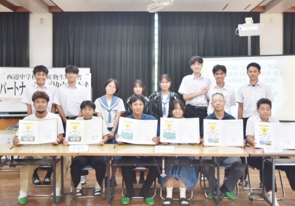 西辺中学校(与那覇周作校長)は6日、同校特別活動室で地元企業3社と「パートナーシップ協定」締結式を行った。