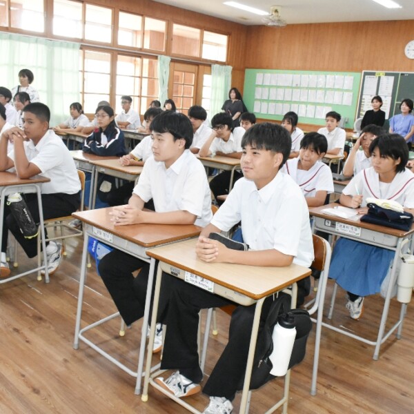 平良中学校は16日、同校1年生の総合的な学習の時間を利用し、市総合博物館学芸員の湯屋秀捷さんと、maaruinc代表の原芹さんを講師に招き、宮古の自然環境と生物についての講話が行われた。