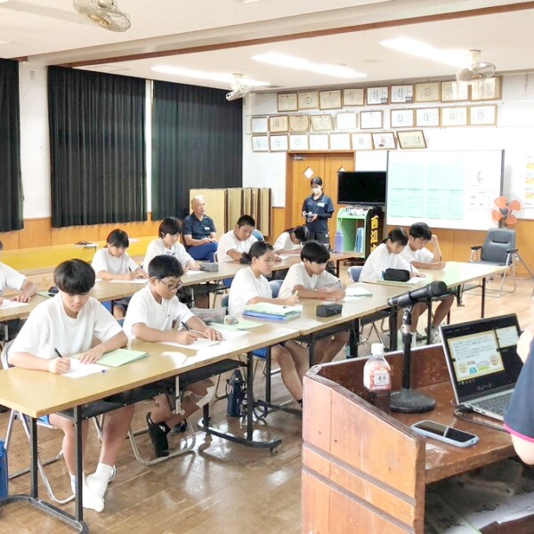 伊良部島小中学校で2日、沖縄総合事務局総務係の島袋秀輔さんを招いた財政教育出前授業が行われた。